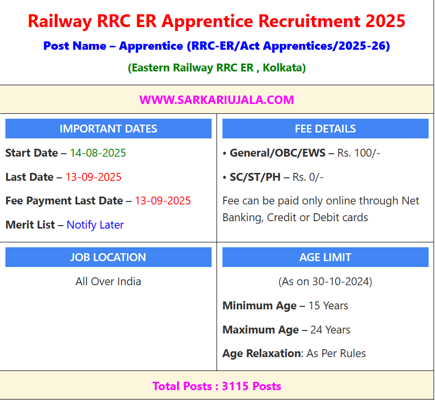 Post Description – RRC Railway Recruitment Cell is inviting online applications for Apprentice for 3115 posts. Interested people meet all the eligibility criteria, apply online Details Of Recruitment Of Railway RRC ER Apprentice Online Form 2025Posts Name – Apprentice Number Of Posts – 3115 Posts Category Wise Posts – Howrah Division- 659 Posts Liluah Workshop- 612 Posts Sealdah Division- 440 Posts Kanchrapara Workshop- 187 Posts Malda Division- 138 Posts Asansol Workshop- 412 Posts Jamalpur Workshop – 667 Posts STIPEND – As Per Rules Education Qualification – 10 Passed And ITI / NCVT Certificate in Related Trade. How to Apply Online Railway RRC ER Apprentice Online Form 2025– Candidates can apply through link provided below or they can also apply through official site of the Railway Recruitment Cell before 13/September/2025. Required Documents For Online Application – Educational Mark sheet And Certificates Aadhar Card / Pan Card Passport Size Photo Signature Selection Mode – Written Exam Merit List