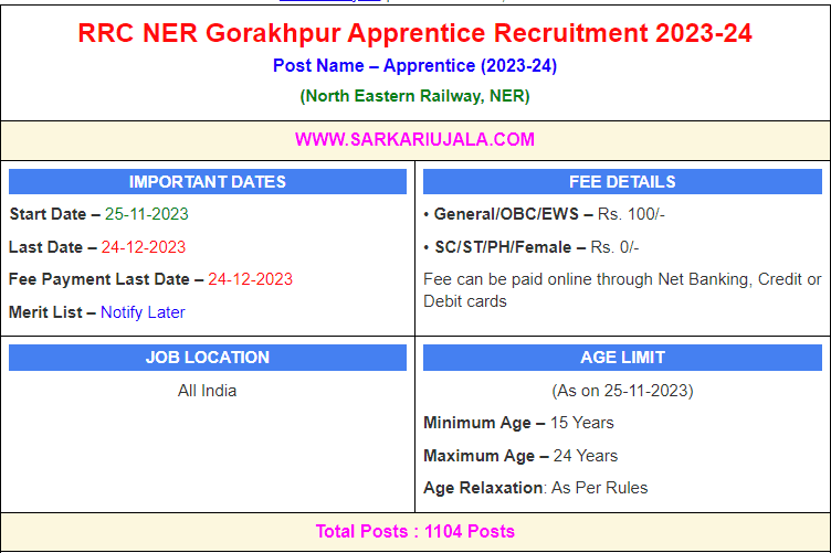 Post Description – RRC North Eastern Railway, NER is inviting online applications for Apprentice for 1104 posts. Interested people meet all the eligibility criteria, apply online Details Of Recruitment Of RRC NER Gorakhpur Apprentice Online Form 2023Posts Name – Trade Apprentice Number Of Posts – 1104 Posts Workshop Wise Posts Details- Mechanical Workshop/ Gorakhpur- 411 Posts Signal Workshop/ Gorakhpur Cantt- 63 Posts Bridge Workshop /Gorakhpur Cantt- 35 Posts Mechanical Workshop/ Izzatnagar- 151 Posts Diesel Shed / Izzatnagar- 60 Posts Carriage & Wagon /lzzatnagar – 64 Posts Carriage & Wagon / Lucknow Jn – 155 Posts Diesel Shed / Gonda – 90 Posts Carriage & Wagon /Varanasi – 75 Posts Stipend – As Per Rules Education Qualification – 10th Passed with 50% Marks & ITI Certificate in relevant trade. How to Apply Online RRC NER Gorakhpur Apprentice Online Form 2023 – Candidates can apply through link provided below or they can also apply through official site of the RRC Western Railway, WR before 24/December/2023. Required Documents For Online Application – 10th / ITI Mark sheet And Certificates Aadhar Card / Pan Card Passport Size Photo Signature Selection Mode – Merit List | |||||