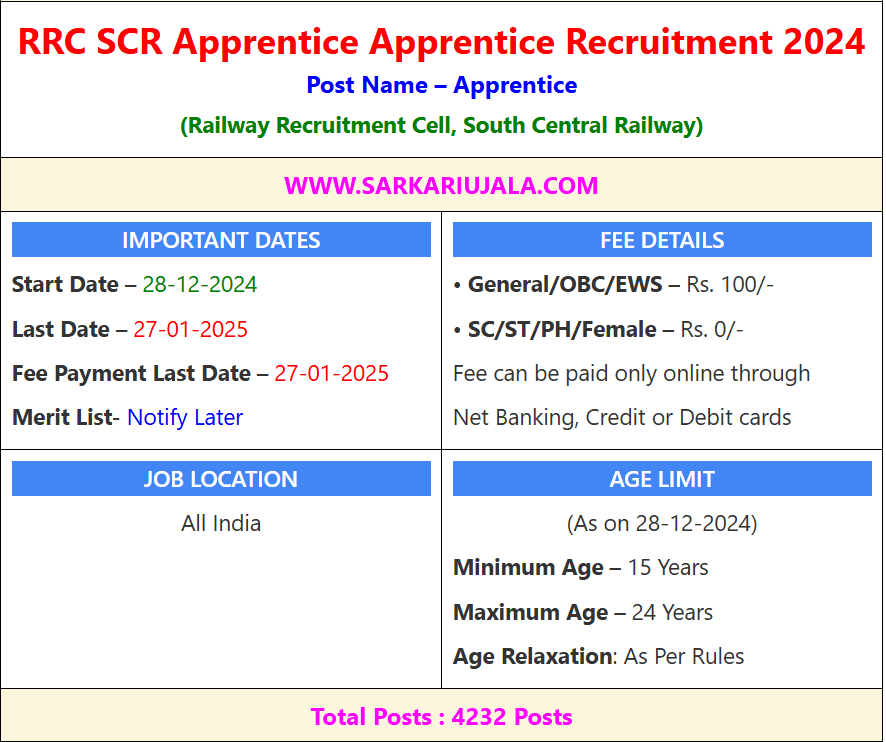 Post Description – The Railway Recruitment Cell (RRC) South Central Railway has announced the 2024 Apprentice Recruitment for various posts. The application process starts on 28th December 2024 and will end on 27th January 2025. The last date to pay the fee is also 27th January 2025. The merit list will be announced later. The application fee for General, OBC, and EWS candidates is Rs. 100, while SC, ST, PH, and Female candidates do not need to pay any fee. The fee can only be paid online through net banking, credit, or debit cards. The job location is across India. The age limit for applicants is between 15 and 24 years as of 28th December 2024, with age relaxation as per the rules. There are a total of 4,232 posts available. Details Of Recruitment Of Railway RRC SCR Apprentice Online Form 2024Posts Name – Apprentice Number Of Posts – 4232 Posts Trade Wise Posts – AC Mechanic – 143 posts Air Conditioning – 32 posts Carpenter – 42 posts Diesel Mechanic – 142 posts Electronic Mechanic – 85 posts Industrial Electronics – 10 posts Electrician – 1053 posts Electrical (S&T) (Electrician) – 10 posts Power Maintenance (Electrician) – 34 posts Train Lighting (Electrician) – 34 posts Fitter – 1742 posts Motor Mechanic Vehicle (MMV) – 8 posts Machinist – 100 posts Mechanic Machine Tool Maintenance (MMTM) – 10 posts Painter – 74 posts Welder – 713 posts Category Wise Posts – General – 1714 Posts OBC – 1143 Posts SC – 635 Posts ST – 317 Posts EWS – 423 Posts Education Qualification – 10th Passed With 50% Marks & ITI Relevant Trade. How to Apply Online Railway RRC SCR Apprentice Online Form 2024 – Candidates can apply through link provided below or they can also apply through official site of the Railway Recruitment Cell before 27/January/2025. Required Documents For Online Application – 10th & ITI Mark sheet And Certificates Aadhar Card / Pan Card Passport Size Photo Signature Selection Mode – Merit List
