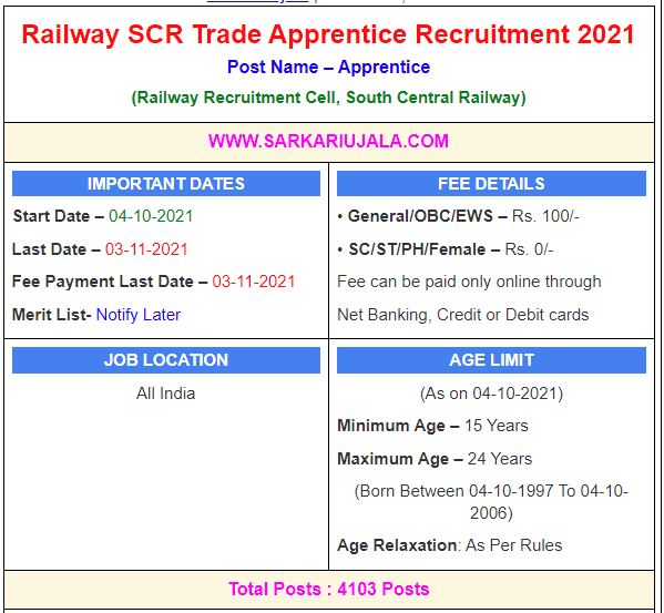 Post Description –Railway Recruitment Cell, South Central Railway is inviting online applications for Apprentice for 4103 posts. Interested people meet all the eligibility criteria, apply online Details Of Recruitment Of Railway RRC SCR Apprentice Online Form 2021Posts Name – Apprentice Number Of Posts – 4103 Posts Trade Wise Posts – AC Mechanic – 250 Posts Carpenter – 18 Posts Diesel Mechanic – 531 Posts Electrician – 1019 Posts Electrician Mechanic – 92 Posts Fitter – 1460 Posts Machinist – 71 Posts MMTM – 05 Posts MMW – 24 Posts Painter – 80 Posts Welder – 553 Posts Category Wise Posts – General – 1645 Posts OBC – 1113 Posts SC – 620 Posts ST – 310 Posts EWS – 415 Posts Education Qualification – 10th Passed With 50% Marks & ITI Relevant Trade. How to Apply Online Railway RRC SCR Apprentice Online Form 2021 – Candidates can apply through link provided below or they can also apply through official site of the Railway Recruitment Cell before 03/Nov/2021. Required Documents For Online Application – 10th & ITI Mark sheet And Certificates Aadhar Card / Pan Card Passport Size Photo Signature Selection Mode – Final Merit List
