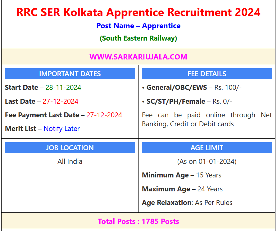 RRC SER Kolkata Apprentice Recruitment 2024Post Name – Apprentice(South Eastern Railway) | |||||