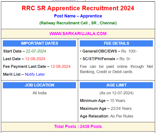 Post Description – RRC Railway Recruitment Cell , Southern Railway is inviting online applications for Apprentice for 2438 posts. Interested people meet all the eligibility criteria, apply online Details Of Recruitment Of RRC SR Apprentice Online Form 2024Posts Name – Trade Apprentice Number Of Posts – 2438 Posts Category Wise Posts – Fresher Candidates- 85 Posts Carriage Work, Perambur- 47 Posts Signal & Telecommunication Workshop / Podanur- 18 Posts Railway Hospital/Perambur (Medical Laboratory Technician (MLT))- 20 Posts Ex-ITI Candidates – 2494 Posts Signal & Telecommunication Workshop / Podanur- 52 Posts Thiruvananthapuram Division- 145 Posts Palakkad Division- 285 Posts Salem Division- 222 Posts Carriage & Wagon Works/Perambur – 350 Posts Loco Works / Perambur – 228 Posts Electrical Workshop / Perambur – 130 Posts Engineering Workshop / Arakkonam – 48 Posts Chennai Division/ Personnel Branch – 24 Posts Chennai Division – Electrical/Rolling Stock / Arakkonam –65 Posts Chennai Division – Electrical/Rolling Stock / Avadi – 65 Posts Chennai Division – Electrical/Rolling Stock / Tambaram – 55 Posts Chennai Division – Electrical/Rolling Stock / Royapuram – 30 Posts Chennai Division – Mechanical (Diesel) – 22 Posts Chennai Division – Mechnical (Carriage & Wagon) – 250 Posts Chennai Division – Railway Hospital (Perambur) – 03 Posts Central Workshops, Ponmalai –201 Posts Tiruchchirappalli Division – 94 Posts Madurai Division – 84 Posts Stipend – As Per Rules Education Qualification – Fresher Candidates– 10th /12th Passed with Minimum 50% Marks. Ex-ITI/ITI Candidate – 10th Passed with ITI / NCVT Certificate in Related Trade How to Apply Online RRC SR Apprentice Online Form 2024– Candidates can apply through link provided below or they can also apply through official site of the Railway Recruitment Cell , Southern Railway before12/August/2024. Required Documents For Online Application – 10th / ITI Mark sheet And Certificates Aadhar Card / Pan Card Passport Size Photo Signature Selection Mode – Merit List