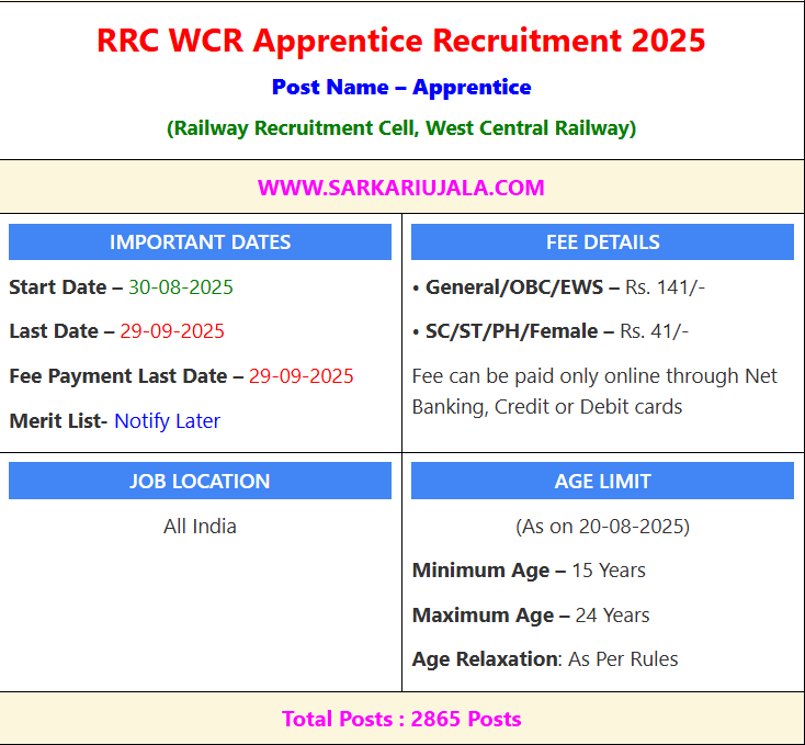 Post Description – Railway Recruitment Cell, West Central Railway is inviting online applications for Apprentice for 2865 posts. Interested people meet all the eligibility criteria, apply online Details Of Recruitment Of Railway RRC WCR Apprentice Online Form 2025Posts Name – Apprentice Number Of Posts – 2865 Posts Category Wise Posts – General – 1150 Posts OBC – 778 Posts SC – 433 Posts ST – 215 Posts EWS – 289 Posts Category Wise Posts – JBP Division – 1136 Posts BPL Division – 558 Posts KOTA Division – 865 Posts CRWS BPL – 136 Posts WRS KOTA – 151 Posts HQ/JBP- 19 Posts Education Qualification – 10th Passed With 50% Marks & ITI Relevant Trade. How to Apply Online Railway RRC WCR Apprentice Online Form 2025 – Candidates can apply through link provided below or they can also apply through official site of the Railway Recruitment Cell before 29/September/2025. Required Documents For Online Application – 10th & ITI Mark sheet And Certificates Aadhar Card / Pan Card Passport Size Photo Signature Selection Mode – Merit List
