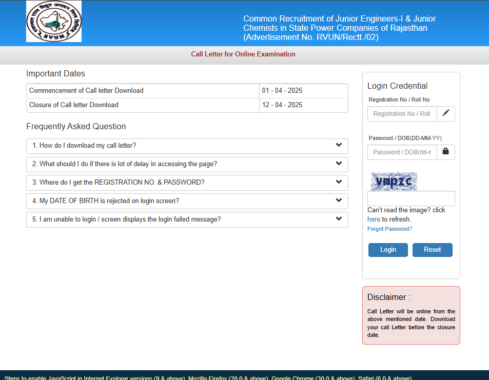 RRVUNL Junior Engineer, Jr Chemist Admit Card 2025Post Name – Junior Engineer & Jr Chemist (Rajasthan Rajya Vidhut Utpadan Nigam Ltd) | |||||
