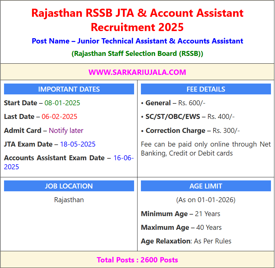 Post Description – The Rajasthan Staff Selection Board (RSSB) has announced the recruitment for Junior Technical Assistant (JTA) and Accounts Assistant positions for 2025, with a total of 2,600 vacancies. The job location is Rajasthan. For more details, visit the official website Details Of Recruitment Of RSSB JTA & Account Assistant Online Form 2025Posts Name – Junior Technical Assistant & Accounts Assistant Number Of Posts – 2600 Posts JTA- 2200 Posts Accounts Assistant- 400 Posts Pay Scale – As Per Rules Education Qualification – Junior Technical Assistant – BE / B.Tech / Engineering Diploma in Agriculture Engineering from Any Recognized Institute in India. Accounts Assistant – Bachelor Degree in Any Stream from Any Recognized University in India with O Level Certificate. How to Apply Online RSSB JTA & Account Assistant Online Form 2025 – Candidates can apply through link provided below or they can also apply through official site of the Rajasthan Staff Selection Board before 06/February/2025. Required Documents For Online Application – Educational Mark sheet And Certificates Aadhar Card / Pan Card Passport Size Photo Signature Selection Mode – Exam Merit List | |||||