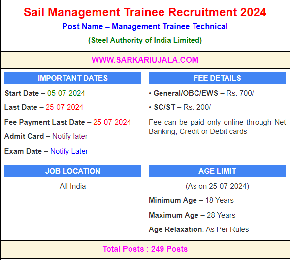 Post Description – SAIL Steel Authority of India Limited is inviting online applications for Management Trainee for 249 posts. Interested people meet all the eligibility criteria, apply online Details Of Recruitment Of Sail Management Trainee Online Form 2024Posts Name – Management Trainee Number Of Posts – 249 Posts Category Wise Posts – Mechanical Engineering ME – 69 Posts Computer Engineering CS – 09 Posts Metallurgical Engineering MT – 63 Posts Chemical Engineering CH – 10 Posts Electrical Engineering EE – 61 Posts Civil Engineering CE – 21 Posts Instrumentation Engineering IN – 11 Posts Pay Scale – As Per Rules Education Qualification – BE / B.Tech Engineering Degree in Related Trade with Minimum 65% Marks (Average of All Semester) And GATE 2024 Score Card. How to Apply Online Sail Management Trainee Online Form 2024 – Candidates can apply through link provided below or they can also apply through official site of the Steel Authority of India Limited before 25/July/2024. Required Documents For Online Application – Educational Mark sheet And Certificates Aadhar Card / Pan Card Passport Size Photo Signature Selection Mode – Written Examination Skill Test Merit List