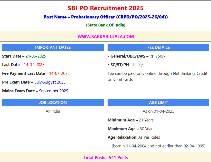 Post Description – SBI State Bank Of India has Been Invited Online application Form For 541 Probationary Officer Posts. Eligible Candidates Can Apply Online Form. Details Of Recruitment Of SBI PO Online Form 2025Posts Name – Probationary Officer Number Of Posts – 541 Posts Category Wise Posts – General – 203 Posts OBC –135 Posts SC – 80 Posts ST – 73 Posts EWS – 50 Posts Pay Scale – Basic pay Rs. 41960/- Education Qualification – Graduation Degree Passed In Any Stream ( As On 30-09-2025) How to Apply Online SBI PO Online Form 2025 – Candidates can apply through link provided below or they can also apply through official site of the State Bank Of India before 14/July/2025. Required Documents For Online Application – Educational Mark sheet And Certificates Aadhar Card / Pan Card Passport Size Photo Signature Selection Mode – Pre/ Mains Exam Interview Merit List