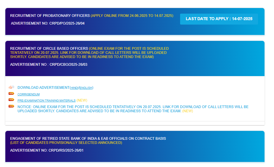 SBI CBO Admit Card 2025Post Name – Circle Based Officer (CRPD/CBO/2025-26/03)(State Bank Of India) | |||||