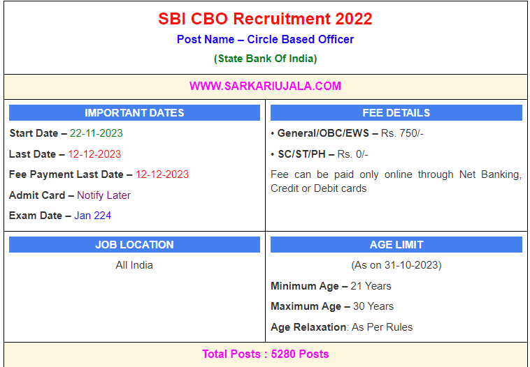 Post Description – SBI State Bank Of India is inviting online applications for Circle Based Officer for 5280 posts. Interested people meet all the eligibility criteria, apply online Details Of Recruitment Of SBI CBO Online Form 2023Posts Name – Circle Based Officer Number Of Posts – 5280 Posts Category Wise Posts – General – 2157 Posts OBC – 1421 Posts SC – 787 Posts ST – 388 Posts EWS – 527 Posts Pay Scale – Rs.36,000 – Rs. 63,840/- Education Qualification – Bachelor Degree in Any Stream & Know the Local Language & 2 Year Experience. How to Apply Online SBI CBO Online Form 2023 – Candidates can apply through link provided below or they can also apply through official site of the State Bank Of India before 12/December/2023. Required Documents For Online Application – Educational Mark sheet And Certificates Aadhar Card / Pan Card Passport Size Photo Signature Selection Mode – CBT Exam Interview Final Merit List