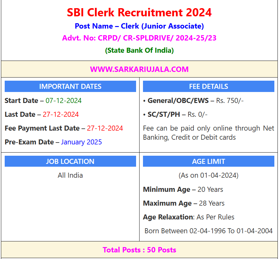 Post Description – The State Bank of India (SBI) is recruiting for the position of Clerk (Junior Associate) under advertisement number CRPD/CR-SPLDRIVE/2024-25/23. The application process starts on December 7, 2024, and ends on December 27, 2024, which is also the last date for fee payment. The preliminary exam will be held in January 2025. The application fee is Rs. 750 for General, OBC, and EWS candidates, while SC, ST, and PH candidates do not have to pay any fee. The fee can be paid online through Net Banking, Credit, or Debit cards. The job location is all across India. Applicants must be between 20 and 28 years old as of April 1, 2024, with age relaxation as per rules. Candidates should be born between April 2, 1996, and April 1, 2004. There are a total of 50 posts available for this recruitment. For more details, visit Sarkari Ujala. Details Of Recruitment Of SBI Junior Associate (Clerk) Ladakh Online Form 2024Posts Name – Clerk (Junior Associate) Number Of Posts – 50 Posts Category Wise Posts – General – 23 Posts OBC – 13 Posts SC – 04 Posts ST – 05 Posts EWS – 05 Posts Pay Scale – As Per Rules Education Qualification – Graduation Degree (As On 31-12-2024) How to Apply Online SBI Junior Associate (Clerk) Ladakh Online Form 2024 – Candidates can apply through link provided below or they can also apply through official site of the SBI State bank of India before 27/December/2024. Required Documents For Online Application – Educational Mark sheet And Certificates Aadhar Card / Pan Card Passport Size Photo Thumb Impression Signature Selection Mode – Pre Exam Main Exam Merit List