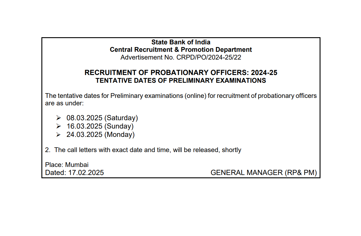 IMPORTANT DATESDate of Exam – 08,16,24 March 2025 Admit Card – 28-02-2025 Result Date – 05-04-2025 Phase II Admit Card– 19-04-2025 Phase II Exam – April/May 2025 Mains Result- 21-05-2025 | VACANCY DETAILSExam Name – SBI PO Pre Recruitment 2024 Total Vacancy- 600 Posts Posts Name- Probationary Officer (PO) | ||||