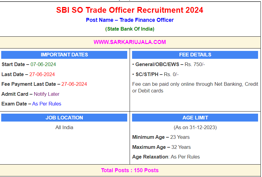 Post Description – SBI State Bank Of India is inviting online applications for Specialist Officer for 150 posts. Interested people meet all the eligibility criteria, apply online Details Of Recruitment Of SBI SO Trade Officer Online Form 2024Posts Name – Trade Finance Officer Number Of Posts – 150 Posts Category Wise Posts – General – 61 Posts OBC- 38 Posts SC- 25 Posts ST- 11 Posts EWS – 15 Posts Pay Scale – As Per Rules Education Qualification – Graduate Degree And Certificate in Forex by IIBF and 2 Years of Experience. How to Apply Online SBI SO Trade Officer Online Form 2024 – Candidates can apply through link provided below or they can also apply through official site of the State Bank Of India before 27/June/2024. Required Documents For Online Application – Educational Mark sheet And Certificates Aadhar Card / Pan Card Passport Size Photo Signature Selection Mode – Shortlisting Interview