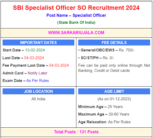 Post Description – SBI State Bank Of India is inviting online applications for Specialist Officer for 131 posts. Interested people meet all the eligibility criteria, apply online Details Of Recruitment Of SBI Specialist Officer SO Online Form 2024Posts Name – Specialist Officers Number Of Posts – 131 Posts Category Wise Posts – CRPD/SCO/2023-24/33 Manager Credit Analyst – 2157 Posts CRPD/SCO/2023-24/32 Assistant Manager (Security Analyst)- 23 Posts Deputy Manager (Security Analyst)- 51 Posts Manager (Security Analyst)- 03 Posts Assistant General Manager (Application Security- 03 Posts CRPD/SCO/2023-24/31 Circle Defence Banking Advisor (CDBA)- 01 Posts Pay Scale – As Per Rules Education Qualification – Manager Credit Analyst – Bachelor Degree in Any Stream with MBA Finance / PGDBA / PGDBM / MMS / CA / CFA / ICWA Exam Passed 3 Year Experience. Assistant Manager (Security Analyst)- BE / B.Tech in Computer Science / IT / Electronics / Electronics & Telecommunication / Electronics and Instrumentation / M.Sc Computer Science / IT / MCA. And 2 Year Experience. Deputy Manager (Security Analyst)- BE / B.Tech in n Computer Science /Computer Applications/ Information Technology / Electronics /Electronics & Telecommunications / Electronics & Communications / Electronics & Instrumentation OR M.Sc CS / IT / MCA And 5 Year Experience. Manager (Security Analyst)- BE / B.Tech in n Computer Science /Computer Applications/ Information Technology / Electronics /Electronics & Telecommunications / Electronics & Communications / Electronics & Instrumentation OR M.Sc CS / IT / MCA 7 Year Experience. Assistant General Manager (Application Security– BE / B.Tech in n Computer Science /Computer Applications/ Information Technology / Electronics /Electronics & Telecommunications / Electronics & Communications / Electronics & Instrumentation OR M.Sc CS / IT / MCA And 12+ Year Experience. Circle Defence Banking Advisor (CDBA)– Retired in the rank of Major General or Brigadier from Indian Army How to Apply Online SBI Specialist Officer SO Online Form 2024 – Candidates can apply through link provided below or they can also apply through official site of the State Bank Of India before 04/March/2024. Required Documents For Online Application – Educational Mark sheet And Certificates Aadhar Card / Pan Card Passport Size Photo Signature Selection Mode – CBT Exam Interview Merit List