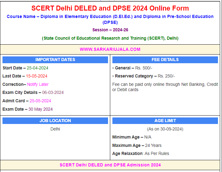Details Of Recruitment Of SCERT Delhi DELED and DPSE 2024 Online Form