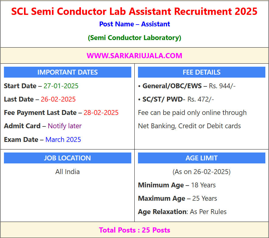Post Description – The Semi-Conductor Laboratory (SCL) is hiring for the position of Assistant in 2025. There are a total of 25 vacancies available. To apply, candidates must be graduates from a recognized university and must have proficiency in using computers. The last date to apply is February 26, 2025. Admit card details will be announced later, and the exam is scheduled for March 2025. For more information, visit www.moneyujala.com. Details Of Recruitment Of SCL Semi Conductor Lab Assistant Online Form 2025 Posts Name – Assistant Number Of Posts – 25 Posts Category Wise Posts – General – 11 Posts OBC – 06 Posts SC/ST – 06 Posts EWS – 02 Posts Pay Scale – Rs. 25500/- To Rs. 81100/- Education Qualification – Graduate in any discipline from a recognized University. And Proficiency in the use of computers. How to Apply Online SCL Semi Conductor Lab Assistant Online Form 2025 – Candidates can apply through link provided below or they can also apply through official site of the Semi Conductor Laboratory before 26/February/2025. Required Documents For Online Application – Educational Mark sheet And Certificates Aadhar Card / Pan Card Passport Size Photo Signature Selection Mode – Written Exam Final Merit List | |||||