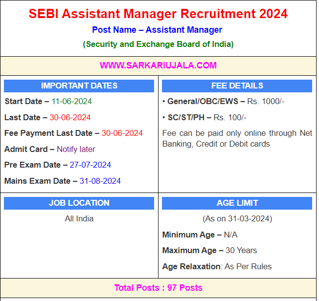 Post Description – SEBI Security and Exchange Board of India is inviting online applications for Assistant Manager (Grade A) for 97 posts. Interested people meet all the eligibility criteria, apply online Details Of Recruitment Of SEBI Assistant Manager Online Form 2024Posts Name – Assistant Manager Number Of Posts – 97 Posts Category Wise Posts – General – 62 Posts Legal – 05 Posts Information Technology – 24 Posts Electrical Engineer – 02 Posts Research – 02 Posts Official Language – 02 Posts Pay Scale – As Per Rules Education Qualification – General – B.Tech/ LLB/CA/ Post Graduation in any Stream Legal – Bachelor’s Degree in Law (LLB) Information Technology – B.Tech / Post Graduation in Computer Science/ IT Electrical Engineer – B.Tech in Electrical Engineering. Research – Post Graduate in a Related Field Official Language – Post Graduation in Hindi/ English How to Apply Online SEBI Assistant Manager Online Form 2024 – Candidates can apply through link provided below or they can also apply through official site of the Security and Exchange Board of India before 30/June/2024. Required Documents For Online Application – Educational Mark sheet And Certificates Aadhar Card / Pan Card Passport Size Photo Signature Selection Mode – Pre Exam Mains Exam Merit List