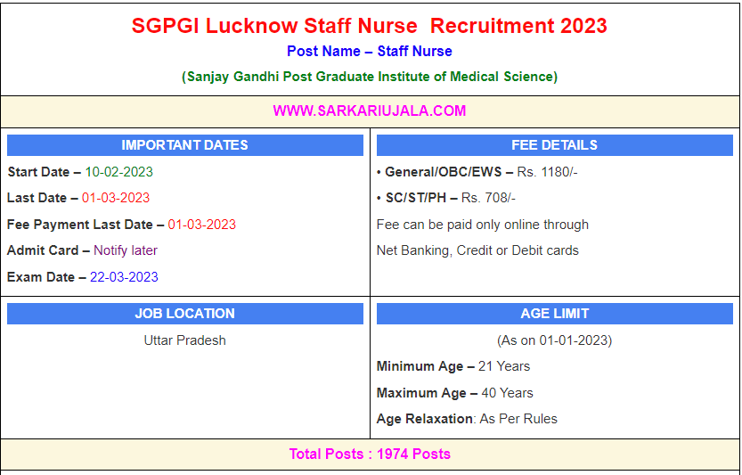 Post Description –SGPGI Sanjay Gandhi Post Graduate Institute of Medical Science is inviting online applications for Staff Nurse for 1974 posts. Interested people meet all the eligibility criteria, apply online Details Of Recruitment Of SGPGI Lucknow Staff Nurse Online Form 2023Posts Name – Staff Nurse Number Of Posts – 1974 Posts Category Wise Posts – General – 790 Posts EWS – 197 Posts OBC – 533 Posts SC – 415 Posts ST – 39 Posts Pay Scale – As Per Rules Education Qualification – B.SC Nursing OR Post Basic B.Sc Nursing OR Diploma in GNM with 2 Year Experience Registration in Indian Nursing Council. How to Apply Online SGPGI Lucknow Staff Nurse Online Form 2023 – Candidates can apply through link provided below or they can also apply through official site of the Sanjay Gandhi Post Graduate Institute of Medical Science before 01/March/2023. Required Documents For Online Application – Educational Mark sheet And Certificates Aadhar Card / Pan Card Passport Size Photo Signature Selection Mode – Written Exam PET/PST Merit List