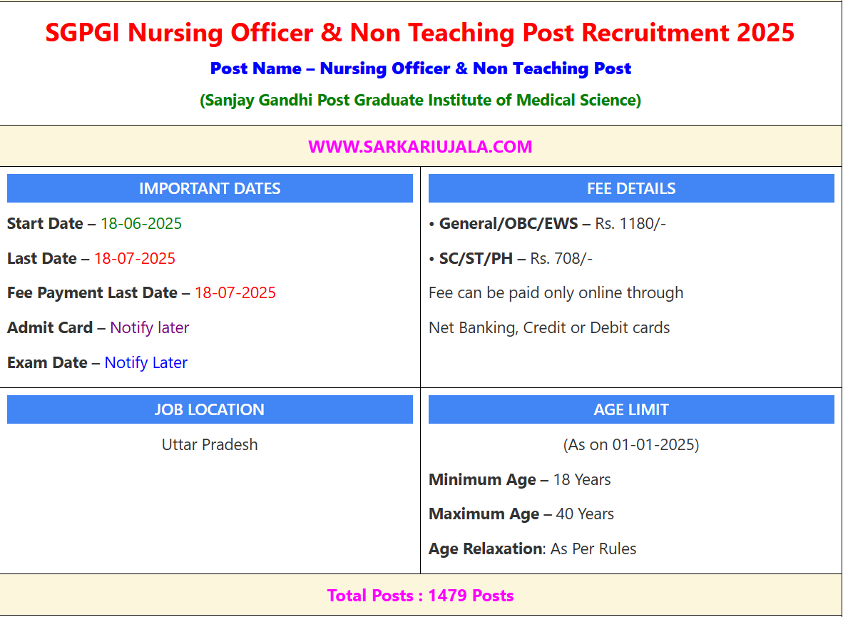 Post Description – SPPGI Sanjay Gandhi Post Graduate Institute of Medical Science is inviting online applications for Nursing Officer & Other Posts for 1479 posts. Interested people meet all the eligibility criteria, apply online Details Of Recruitment Of SGPGI Nursing Officer & Non Teaching Post Online Form 2025Posts Name – Nursing Officer & Non Teaching Post Number Of Posts – 1479 Posts Category Wise Posts – Nursing Officer- 1200 Posts Junior Accounts Officer- 06 Posts Technical Officer – 01 Posts Nuclear Medicine Technologist- 07 Posts Store Keeper- 22 Posts Medical Social Service Officer Grade – II – 02 Posts Senior Administration Assistant – 32 Posts Stenographer- 64 Posts CSSD Assistant – 20 Posts Draftsman- 01 Posts Hospital Attendant Grade II – 43 Posts O.T. Assistant – 81 Posts Pay Scale – As Per Rules Education Qualification – Nursing Officer– B.SC Nursing / Post B.SC Nursing with Registration in Nursing Council OR GNM Diploma with Registration and 2 Year Experience. Junior Accounts Officer– B.Com (55% & above) with Accountancy with 2 years experience of accounts & knowledge of computer. Technical Officer – Degree of a recognized University in Electronics/Glass Technology/Mechanical Engineering/any other branch of Engineering considered relevant OR Nuclear Medicine Technologist– B.Sc. In Life science and other science plus one year diploma in Medical Radiation and Isotope Techniques (DMRIT) OR equivalent approved by AERB. Store Keeper– Degree of a recognized University, AND Post-graduate degree/ Diploma in Material Management of a recognized University/ Institution; Knowledge of computers. Medical Social Service Officer Grade – II – Master’s Degree in Social Work from a recognized University/Institution. And Experience in the line with a Welfare of Health Agency, preferably dealing with Medical/ Public Health Service. Senior Administration Assistant – Graduate with knowledge of noting & drafting and knowledge of computer. (ii) A typing speed of 30 w.p.m. in English OR 25 w.p.m. in Hindi. Stenographer– Graduate Degree And Stenography speed – 80 w.p.m. in Hindi OR English And Typing speed – 25 w.p.m. in Hindi OR 30 w.p.m. in English, on computer/ desktop And Knowledge in computer applications. CSSD Assistant – 10+2 in Science with Diploma in CSSD, failing which 3 years experience in CSSD in large teaching hospital. Draftsman– 10th Passed from a recognized Board/University; and 2 years’ Diploma/Certificate in Civil Draughtsmanship from ITI or equivalent from a recognized Institute. AND one year experience in the line. Hospital Attendant Grade II – 10th Standard Passed And Experience of having worked in a Civil or Military Hospital, or in a Nursing Home or with a Medical Practitioner O.T. Assistant – B.Sc. (Anesthesia & Operation Theatre Technologist)/ B.Sc. (OT Technology/ B.Sc (Anesthesia Technology) from a recognized University/Institute. How to Apply Online SGPGI Nursing Officer & Non Teaching Post Online Form 2025 – Candidates can apply through link provided below or they can also apply through official site of the SPPGI Sanjay Gandhi Post Graduate Institute of Medical Science before 18/July/2025. Required Documents For Online Application – Educational Mark sheet And Certificates Aadhar Card / Pan Card Passport Size Photo Signature Selection Mode – CTR Exam Skill Test Merit List