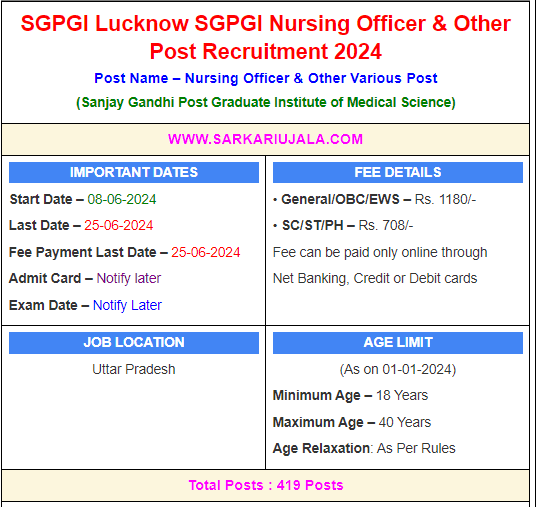 SGPGI Lucknow SGPGI Nursing Officer & Other Post Recruitment 2024Post Name – Nursing Officer & Other Various Post(Sanjay Gandhi Post Graduate Institute of Medical Science) | |||||