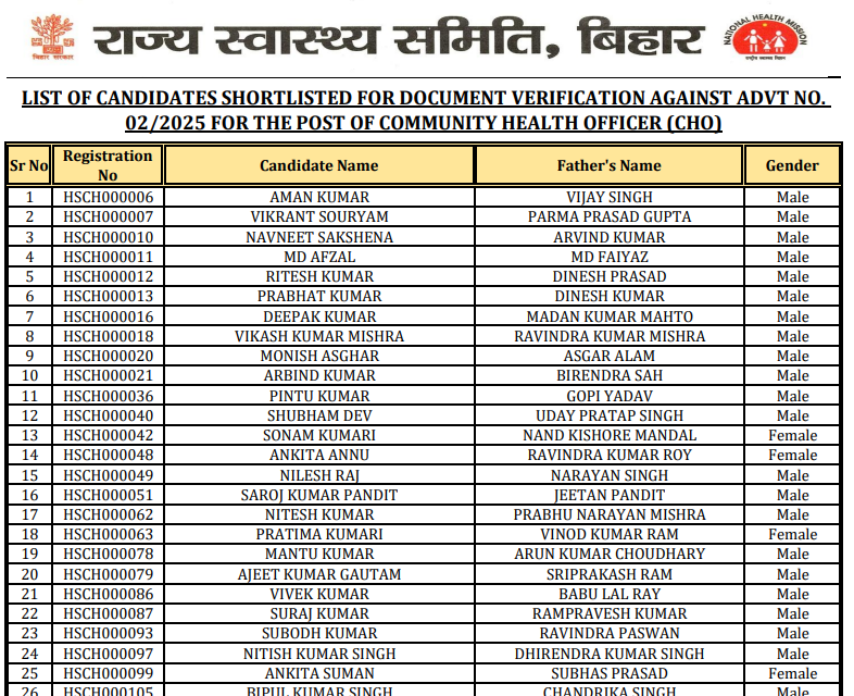 SHSB Bihar CHO Admit Card 2025Post Name – Community Health Officer (02/2025)(State Health Society , Bihar) | |||||