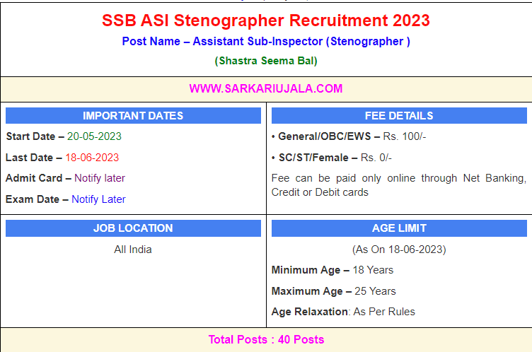Post Description – SSB Shastra Seema Bal is inviting online applications for Assistant Sub-Inspector for 40 posts. Interested people meet all the eligibility criteria, apply online Details Of Recruitment Of SSB ASI Stenographer Online Form 2023Posts Name – Assistant Sub-Inspector Number Of Posts – 40 Posts Category Wise Posts – General – 14 Posts EWS – 01 Posts OBC – 17 Posts SC – 06 Posts ST – 02 Posts Pay Scale – Rs. 29,200 – 92,300/- Education Qualification – 12th Passed And Dictation 10 Minutes @ 80 Words Per Minutes. And Stenography 50 Minutes in English OR 65 Minutes In Hindi. Physical Standard Test Details – Height- 165 Cms (Male), 155 Cms (Female) ST- 162.5 (Male), 150 Cms (Female) Race- 1.6 Kms In 6 Minutes 30 Second (Male) & 800 Meter In 4 Minutes. How to Apply Online SSB ASI Stenographer Online Form 2023 – Candidates can apply through link provided below or they can also apply through official site of the Sastra Seema Bal before 18 June 2023. Required Documents For Online Application – 10th/ 12th Mark sheet And Certificates Aadhar Card / Pan Card Passport Size Photo Signature Selection Mode – Written Exam PET/PST Merit List