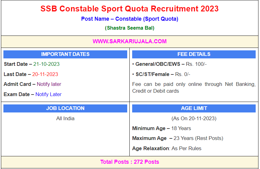 Post Description – SSB Shastra Seema Bal is inviting online applications for Constable (Sport Quota) for 272 posts. Interested people meet all the eligibility criteria, apply online Details Of Recruitment Of SSB Constable Sport Quota Online Form 2023Posts Name – Constable (Sport Quota) Number Of Posts – 272 Posts Pay Scale – Rs. 21700 – 69100/- Education Qualification – 10th Passed And Sportsperson in International/State/University/State School Play Or National Awarded. How to Apply Online SSB Constable Sport Quota Online Form 2023 – Candidates can apply through link provided below or they can also apply through official site of the Sastra Seema Bal before 20 November 2023. Required Documents For Online Application – 10th / ITI Mark sheet And Certificates Aadhar Card / Pan Card Passport Size Photo Signature Selection Mode – Written Exam PET/PST Merit List | |||||