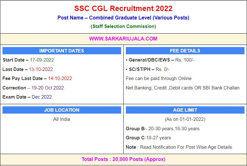 Post Description –SSC Staff Selection Commission is inviting online applications for Combined Graduate Level Posts . Interested people meet all the eligibility criteria, apply online Details Of Recruitment Of SSC CGL Online Form 2022Posts Name – Various Post (Combined Graduate Level) Number Of Posts – 20,0000 Posts (Approx) | |||||