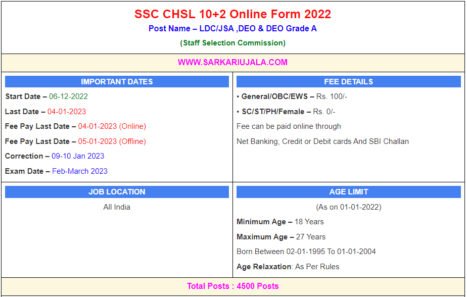 Post Description – SSC Staff Selection Commission is inviting online applications for CHSL 10+2 For 4500 Posts. Interested people meet all the eligibility criteria, apply online Details Of Recruitment Of SSC CHSL 10+2 Online Form 2022Posts Name – LDC/JSA ,DEO & DEO Grade A Number Of Posts – 4500 posts Category Wise Posts – LDC/JSA – DEO(Data Entry Operator) – DEO Grade A – Pay Scale – LDC /JSA- Rs. 19,900-63,200/- DEO- Rs. 25,500-81,100/- Education Qualification – 10+2 Passed from a recognized Board or University. How to Apply Online SSC CHSL 10+2 Online Form 2022 – Candidates can apply through link provided below or they can also apply through official site of the Staff Selection Board before 04/January/2023. Required Documents For Online Application – 10th/12th Mark sheet And Certificates Aadhar Card / Pan Card Passport Size Photo Signature Selection Mode – Tier I Exam – CBT Tier II – Descriptive Paper Tier III – Typing Test/ Skill Test Final Merit List