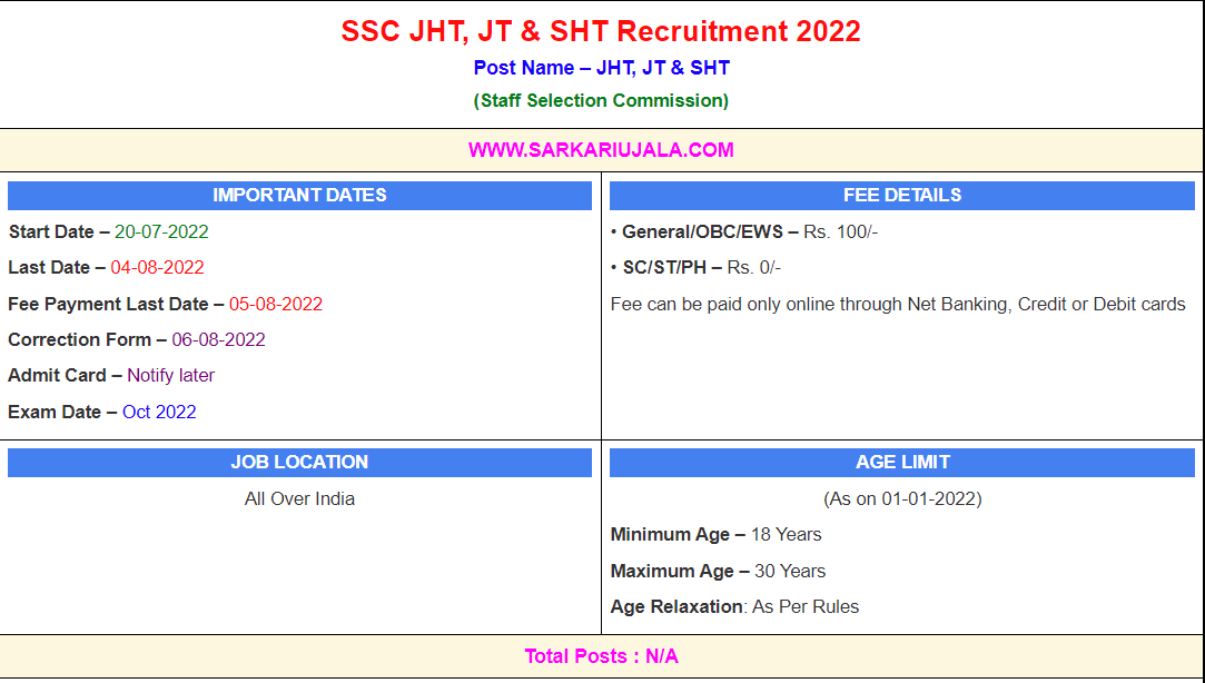 SSC JHT, JT & SHT Recruitment 2022Post Name – JHT, JT & SHT(Staff Selection Commission) | |||||