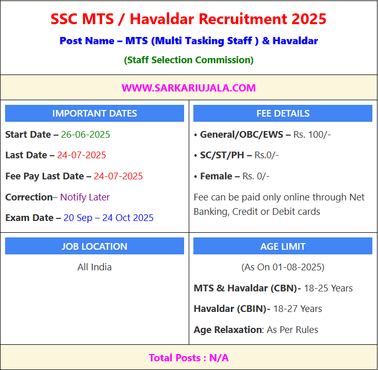 Post Description – SSC Staff Selection Commission is inviting online applications for Multi Tasking Staff MTS & Havildar 8021 Posts. Interested people meet all the eligibility criteria, apply online Details Of Recruitment Of SSC MTS & Havildar Online Form 2025Posts Name – Multi Tasting Staff & Havaldar Number Of Posts – 8021 Posts Category Wise Posts- MTS (Age-18-25 yrs) – 6078 Posts General- 2859 Posts OBC- 1486 Posts SC- 665 Posts ST- 472 Posts EWS- 596 Posts MTS (Age-18-27 yrs) – 732 Posts General- 323 Posts OBC- 215 Posts SC- 56 Posts ST- 49 Posts EWS- 89 Posts Havildar – 1211 Posts General- 531 Posts OBC- 293 Posts SC- 149 Posts ST- 106 Posts EWS- 132 Posts Pay Scale – As Per Rules Education Qualification – 10th Passed From Any Recognized Board (cut-off Date : 01-08-2025) Details Of Physical Standards for Havildar –Height Male – 157.5 Cms Female – 152 Cms Chest Male – 76 – 81 Cms Cycling Male – 8 Km in 30 Minute, Female – 3 Km in 25 Minute Walking Male – 1600 meter in 15 Minute, Female – 1 Km in 20 Minute How to Apply Online SSC MTS / Havaldar Online Form 2025 – Candidates can apply through link provided below or they can also apply through official site of the Staff Selection Commission before 24/July/2025. Required Documents For Online Application – 10th Mark sheet And Certificates Aadhar Card / Pan Card Passport Size Photo Signature Selection Mode – CBT Exam PET (Havildar) Merit List | |||||