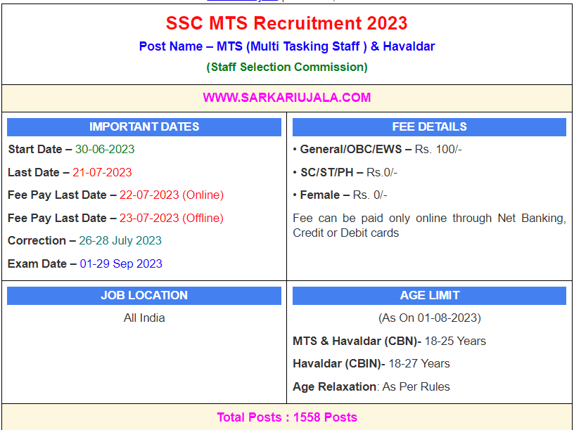 Post Description – SSC Staff Selection Commission is inviting online applications for Multi Tasking Staff MTS & Havildar posts. Interested people meet all the eligibility criteria, apply online Details Of Recruitment Of SSC MTS Online Form 2023Posts Name – Multi Tasting Staff & Havaldar Number Of Posts – 1558 Posts Category Wise Posts- MTS (Age Group 18-25) – 998 Posts General- 518 Posts OBC- 250 Posts SC- 79 Posts ST- 44 Posts EWS- 107 Posts MTS (Age Group 18-27) – 200 Posts General- 100 Posts OBC- 53 Posts SC- 14 Posts ST- 13 Posts EWS- 20 Posts Havildar – 360 posts General- 153 Posts OBC- 81 Posts SC- 52 Posts ST- 38 Posts EWS- 36 Posts Pay Scale – Rs 5200- 20200 + Grade Pay Rs.1800 Education Qualification – 10th Passed From Any Recognized Board Details Of Physical Standards for Havaldar –Height Male – 157.5 Cms Female – 152 Cms Chest Male – 76 – 81 Cms Cycling Male – 8 Km in 30 Minute, Female – 3 Km in 25 Minute Walking Male – 1600 meter in 15 Minute, Female – 1 Km in 20 Minute How to Apply Online SSC MTS Online Form 2023 – Candidates can apply through link provided below or they can also apply through official site of the Staff Selection Commission before 14/July/2023. Required Documents For Online Application – 10th Mark sheet And Certificates Aadhar Card / Pan Card Passport Size Photo Signature Selection Mode – CBT Exam Merit List