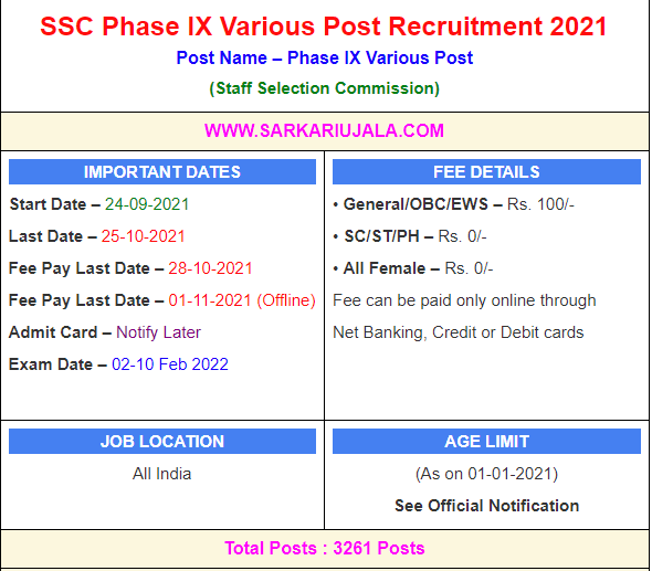 Post Description – Staff Selection Commission is inviting online applications for Various Posts for 3261 posts. Interested people meet all the eligibility criteria, apply online Details Of Recruitment Of SSC Phase IX Various Post Online Form 2021Posts Name – Various Posts (Phase IX) Number Of Posts – 3261 Posts Category Wise Posts – General – 1366 Posts OBC – 788 Posts SC – 477 Posts ST – 249 Posts EWS – 381 Posts Pay Scale – As Per Rules Education Qualification – Matric- 10th passed From Recognized Board in India. Intermediate – 10+2 Passed Any Recognized Board in India Graduation – Bachelor Degree in Any Stream How to Apply Online SSC Phase IX Various Post Online Form 2021– Candidates can apply through link provided below or they can also apply through official site of the Staff Selection Commission before 28/Oct/2021. Required Documents For Online Application – 10th / 12th/Graduation Mark sheet And Certificates Aadhar Card / Pan Card Passport Size Photo Signature Selection Mode – Pre Exam Mains Exam PET/PST (If Applicable) Skill Test (If Applicable) Final Merit List
