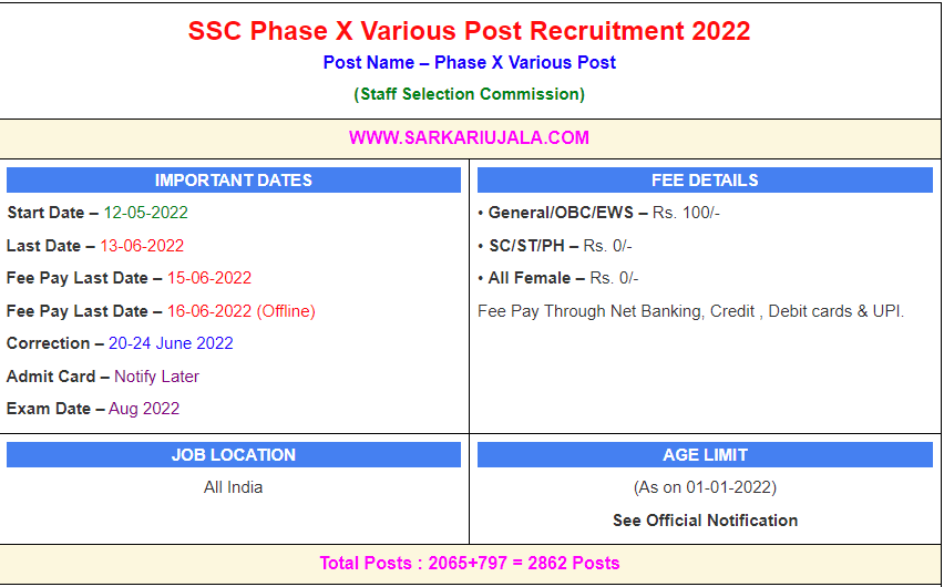 Post Description – SSC Staff Selection Commission is inviting online applications for Various Posts for 1920 posts. Interested people meet all the eligibility criteria, apply online Details Of Recruitment Of SSC Phase X Various Post Online Form 2022Posts Name – Various Posts (Phase X) Number Of Posts – 2862 Posts Category Wise Posts – General –915 Posts OBC –599 Posts SC – 248 Posts ST – 121 Posts EWS –182 Posts For Ladakh –797 Posts Pay Scale – As Per Rules Education Qualification – Matric- 10th passed From Recognized Board in India. Intermediate – 12th Passed Any Recognized Board in India Graduation – Bachelor Degree in Any Stream How to Apply Online SSC Phase X Various Post Online Form 2022– Candidates can apply through link provided below or they can also apply through official site of the Staff Selection Commission before 13/June/2022. Required Documents For Online Application – 10th / 12th/Graduation Mark sheet And Certificates Aadhar Card / Pan Card Passport Size Photo Signature Selection Mode – Pre & Mains Exam PET/PST (If Applicable) Skill Test (If Applicable) Final Merit List