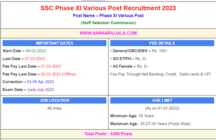 SSC Phase XI Various Post Recruitment 2023Post Name – Phase XISSC Phase XI Online Various Post(Staff Selection Commission) | |||||