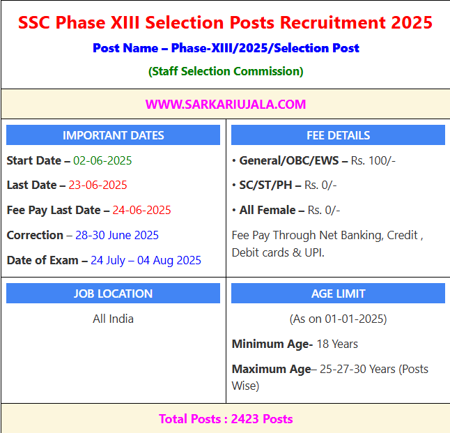 Post Description – SSC Staff Selection Commission is inviting online applications for Various Posts For 2423 Posts. Interested people meet all the eligibility criteria, apply online Details Of Recruitment Of SSC Selection Phase XIII Online Form 2025Posts Name – Selection Posts (Phase XIII) Number Of Posts – 2423 Posts Category Wise Posts – General – 1169 Posts OBC – 561 Posts SC – 314 Posts ST – 148 Posts EWS – 231 Posts Pay Scale – As Per Rules Education Qualification – Matric- 10th passed From Recognized Board in India. Intermediate – 12th Passed Any Recognized Board in India Graduation – Bachelor Degree in Any Stream How to Apply Online SSC Phase XIII Various Post Online Form 2025– Candidates can apply through link provided below or they can also apply through official site of the Staff Selection Commission before 24/June/2025. Required Documents For Online Application – 10th / 12th/Graduation Mark sheet And Certificates Aadhar Card / Pan Card Passport Size Photo Signature Selection Mode – Tier I / Tier II Exam PET/PST (If Applicable) Skill Test (If Applicable) Final Merit List