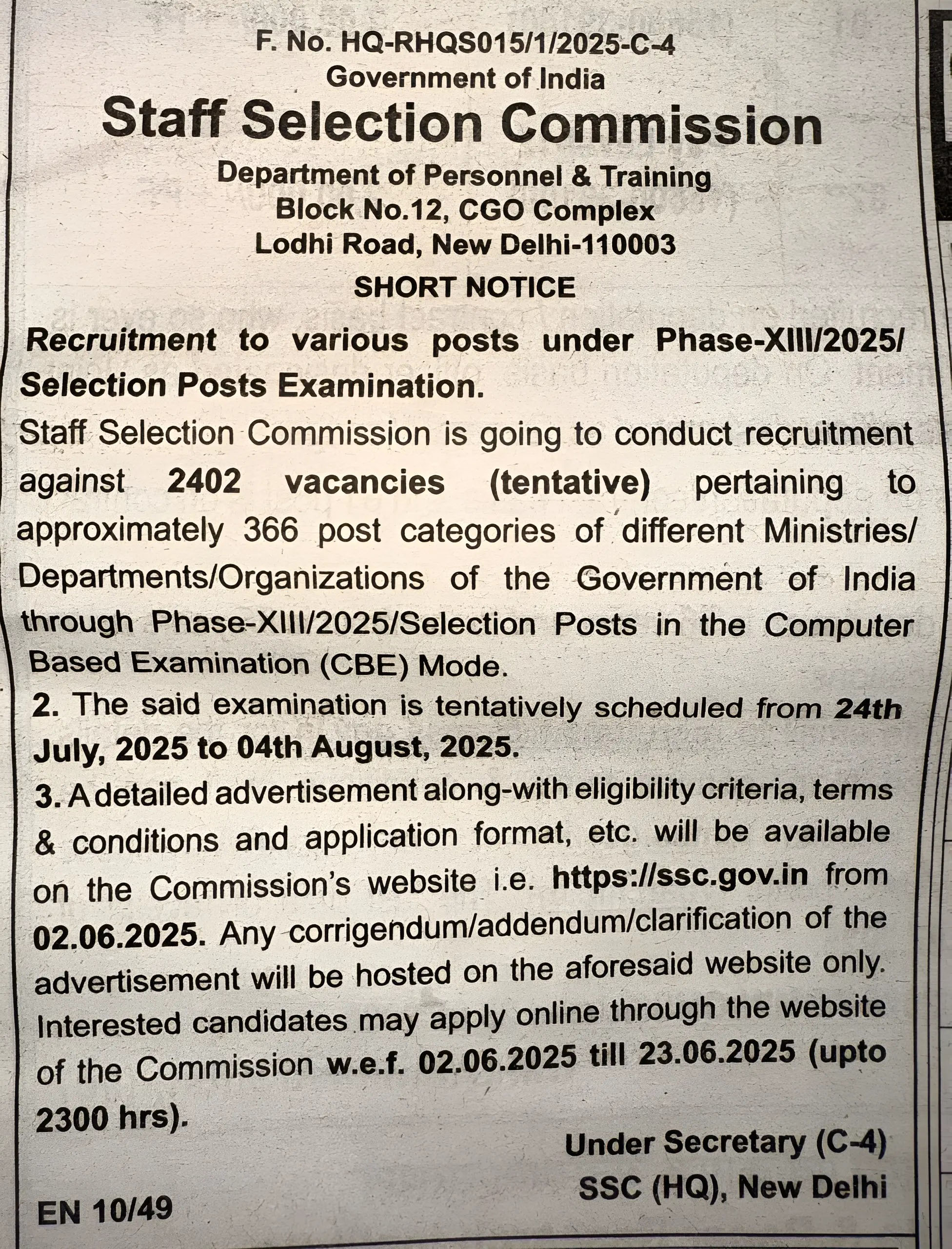 SSC Phase XIII Selection Posts Recruitment 2025Post Name – Phase-XIII/2025/Selection Post(Staff Selection Commission) | |||||