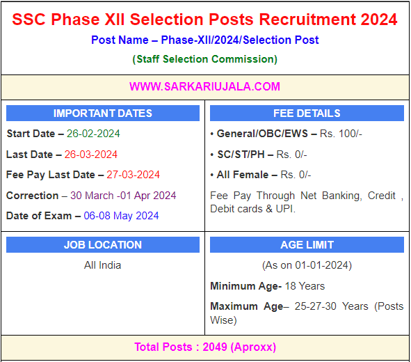 Post Description – SSC Staff Selection Commission is inviting online applications for Various Posts for 2049 posts. Interested people meet all the eligibility criteria, apply online Details Of Recruitment Of SSC Selection Phase XII Online Form 2024Posts Name – Selection Posts (Phase XII) Number Of Posts – 2049 Posts Category Wise Posts – General – 1028 Posts OBC – 456 Posts SC – 255 Posts ST – 124 Posts EWS – 186 Posts Pay Scale – As Per Rules Education Qualification – Matric- 10th passed From Recognized Board in India. Intermediate – 12th Passed Any Recognized Board in India Graduation – Bachelor Degree in Any Stream How to Apply Online SSC Phase XII Various Post Online Form 2024 – Candidates can apply through link provided below or they can also apply through official site of the Staff Selection Commission before 18/March/2024. Required Documents For Online Application – 10th / 12th/Graduation Mark sheet And Certificates Aadhar Card / Pan Card Passport Size Photo Signature Selection Mode – Tier I / Tier II Exam PET/PST (If Applicable) Skill Test (If Applicable) Final Merit List