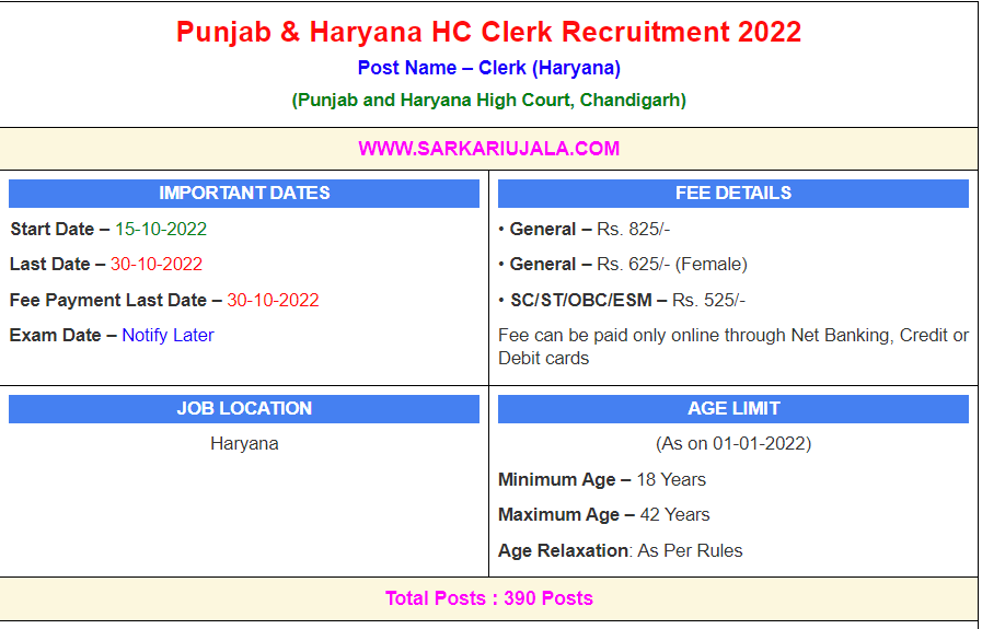 Post Description – Punjab and Haryana High Court, Chandigarh is inviting online applications for Clerk for 390 posts. Interested people meet all the eligibility criteria, apply online Details Of Recruitment Of Punjab & Haryana HC Clerk Online Form 2022Posts Name – Clerk Number Of Posts – 390 Posts Category Wise Posts – General – 198 Posts BC-A – 45 Posts BC-B – 27 Posts SC/ST – 66 Posts PHC – 05 Posts ExSM – 49 Posts Pay Scale – As Per Rules Education Qualification – Possess Bachelor Degree Of Arts OR Bachelor of Science thereto from a recognized university. How to Apply Online Punjab & Haryana HC Clerk Online Form 2022 – Candidates can apply through link provided below or they can also apply through official site of the Punjab and Haryana High Court, Chandigarh before 30/Oct/2022 Required Documents For Online Application – Educational Mark sheet And Certificates Aadhar Card / Pan Card Passport Size Photo Signature Selection Mode – Written Examination Skill Test Final Merit List