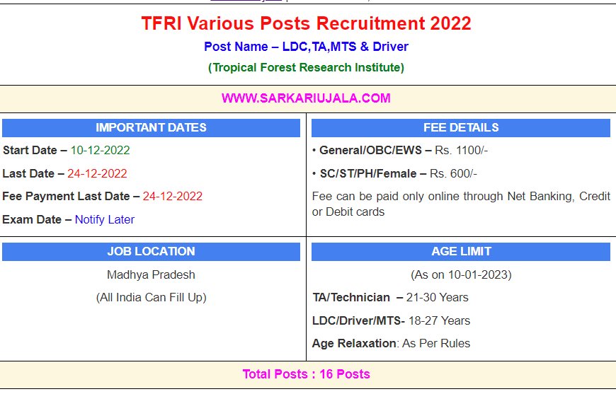 Post Description –TFRI Tropical Forest Research Institute is inviting online applications for Tropical Forest Research Institute for 16 posts. Interested people meet all the eligibility criteria, apply online Details Of Recruitment Of TFRI LDC,TA,MTS & Driver Online Form 2023Posts Name – LDC,TA,MTS & Driver Number Of Posts – 16 Posts Category Wise Posts – Technical Assistant II (Field /Lab) – 06 Posts LDC – 07Posts Technician (Plumber) – 01 Posts Driver – 01 Posts MTS – 01 Posts Pay Scale – As Per Rules Education Qualification – Technical Assistant II (Field /Lab) – Bachelor Degree in Science With Botany/Zoology/Biotechnology/Forestry/Agriculture LDC – 12th Passed & Typing 30 wpm in English or 25 wpm In Hindi On Manual Typewriter OR 35 wpm in English or 30 wpm In Hindi On Computer Technician (Plumber) – 10th Passed & ITI Driver – 10th Passed & Valid Driving license With 03 Years Experience MTS – 10th Passed How to Apply Online TFRI LDC,TA,MTS & Driver Online Form 2023 – Candidates can apply through link provided below or they can also apply through official site of the Tropical Forest Research Institute before 24/December/2022. Required Documents For Online Application – Educational Mark sheet And Certificates Aadhar Card / Pan Card Passport Size Photo Signature Selection Mode – Written Exam PST Merit List