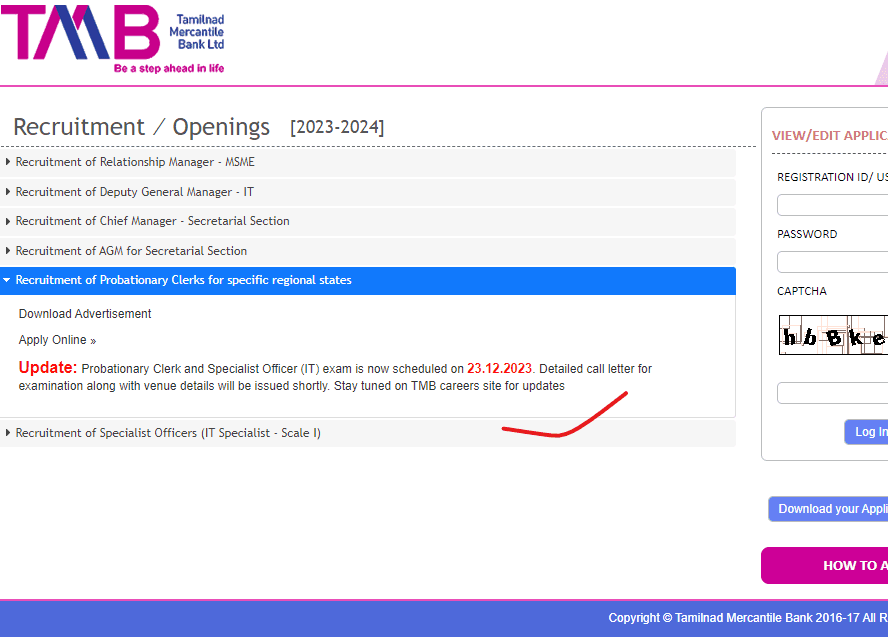 Post Description : TMB Tamilnad Mercantile Bank Ltd Has Been Released Exam Date For TMB Bank Probationary Clerk Online Form 2023. Which Exam Date Is 23 December 2023. Interested People Download Admit card With Using Your Roll No & DOB . Instructions for Downloading the TMB Bank Probationary Clerk Admit Card 2023 : 1. In order to download their TMB Bank Probationary Clerk Admit Card 2023 candidates are required to go to the important link section provided below. 2. After getting the link candidates need to click it for downloading their TMB Bank Admit Card. 3. Candidates need to provide their following details-: Registration No. /Roll No. DOB/Password Captcha Code(if specified) 4. After providing their details appropriately candidates will be able to download their TMB Bank Admit Card. 5.Candidates can also download their Admit Card from official site of the TMB Bank.