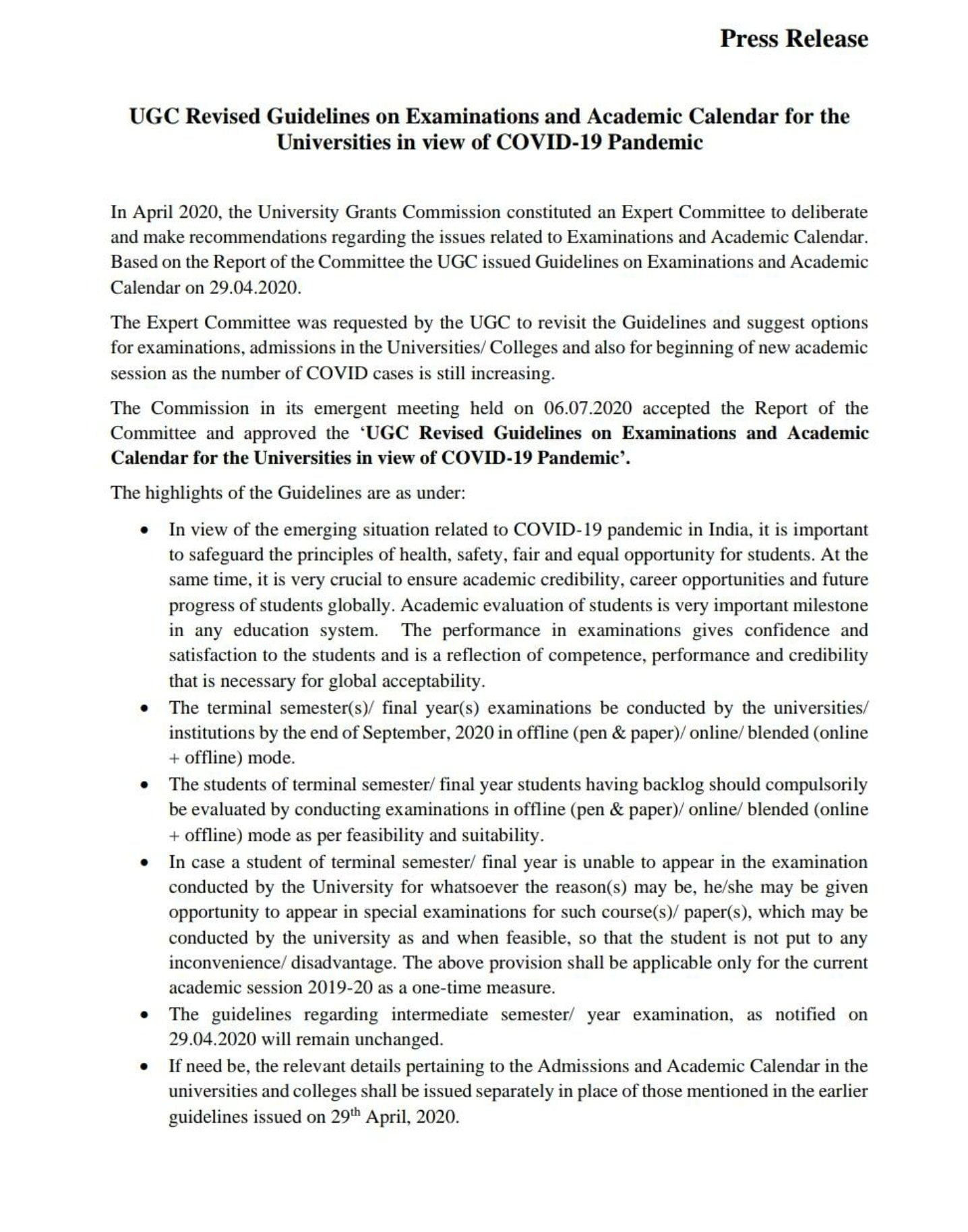 University Grants Commission (UGC) issues revised guidelines regarding conduct of terminal semesters/final year examination Date by the Universities/institutions. Examinations to be completed by end of September 2020 in offline/online/blended (online+offline) mode.