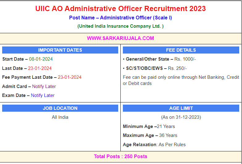 Post Description – UIIC United India Insurance Company Ltd is inviting Administrative Officer online applications for 250 posts. Interested people meet all the eligibility criteria, apply online Details Of Recruitment Of UIIC AO Administrative Officer Online Form 2024Posts Name – Administrative Officer (Scale I) Number Of Posts – 250 Posts Category Wise Posts – General – 102 Posts OBC – 67 Posts SC – 37 Posts ST – 20 Posts EWS – 24 Posts Pay Scale – Rs. 50,925 – 96,765/- Education Qualification – Graduate Degree With 60% Marks From Any Recognized University. (55% Marks For For SC/ST ) How to Apply Online UIIC AO Administrative Officer Online Form 2024 – Candidates can apply through link provided below or they can also apply through official site of the United India Insurance Company Ltd. before 23/January/2024. Required Documents For Online Application – Educational Mark sheet And Certificates Aadhar Card / Pan Card Passport Size Photo Signature Selection Mode – Written Exam Merit List | |||||