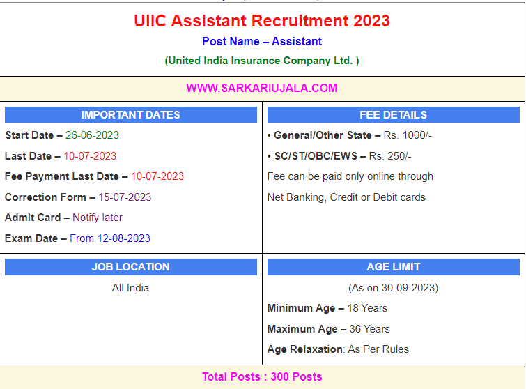 Post Description – UIIC United India Insurance Company Ltd is inviting Assistant online applications for s for 300 posts. Interested people meet all the eligibility criteria, apply online Details Of Recruitment Of UIIC Assistant Online Form 2023-24Posts Name – Assistant Number Of Posts – 300 Posts Category Wise Posts – General – 159 Posts OBC – 55 Posts SC – 30 Posts ST – 26 Posts EWS – 30 Posts Pay Scale – Rs. 22,405 – 62,265/- + Grade Pay Rs.1900/- Education Qualification – Graduate Degree From Any Recognized University. How to Apply Online UIIC Assistant Online Form 2023-24 – Candidates can apply through link provided below or they can also apply through official site of the United India Insurance Company Ltd. before 06/January/2023. Required Documents For Online Application – Educational Mark sheet And Certificates Aadhar Card / Pan Card Passport Size Photo Signature Selection Mode – Written Examination Merit List | |||||