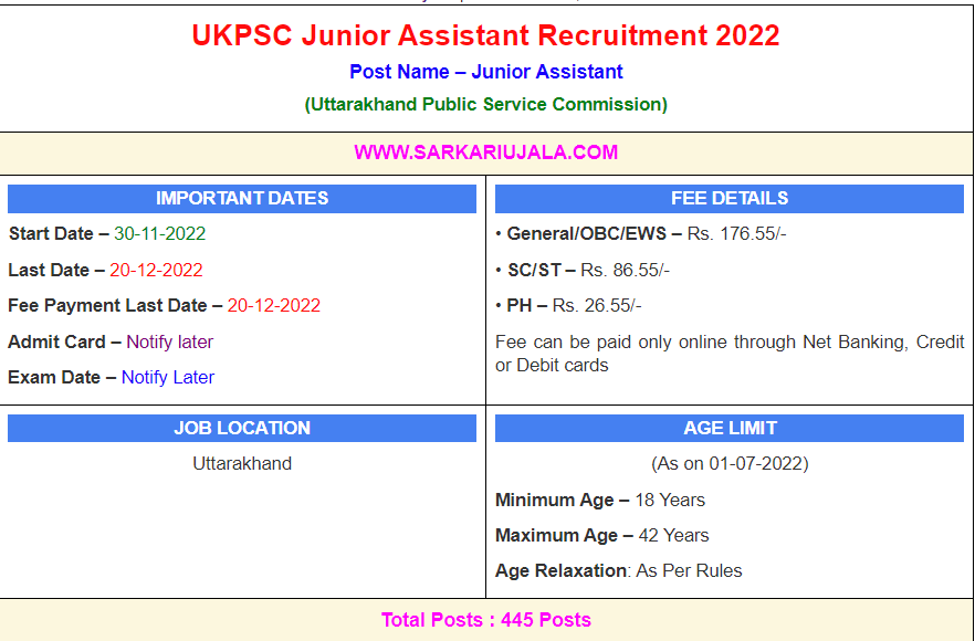Post DescriptionUKPSC Uttarakhand Public Service Commission is inviting online applications for Junior Assistant for 445 posts. Interested people meet all the eligibility criteria, apply online
