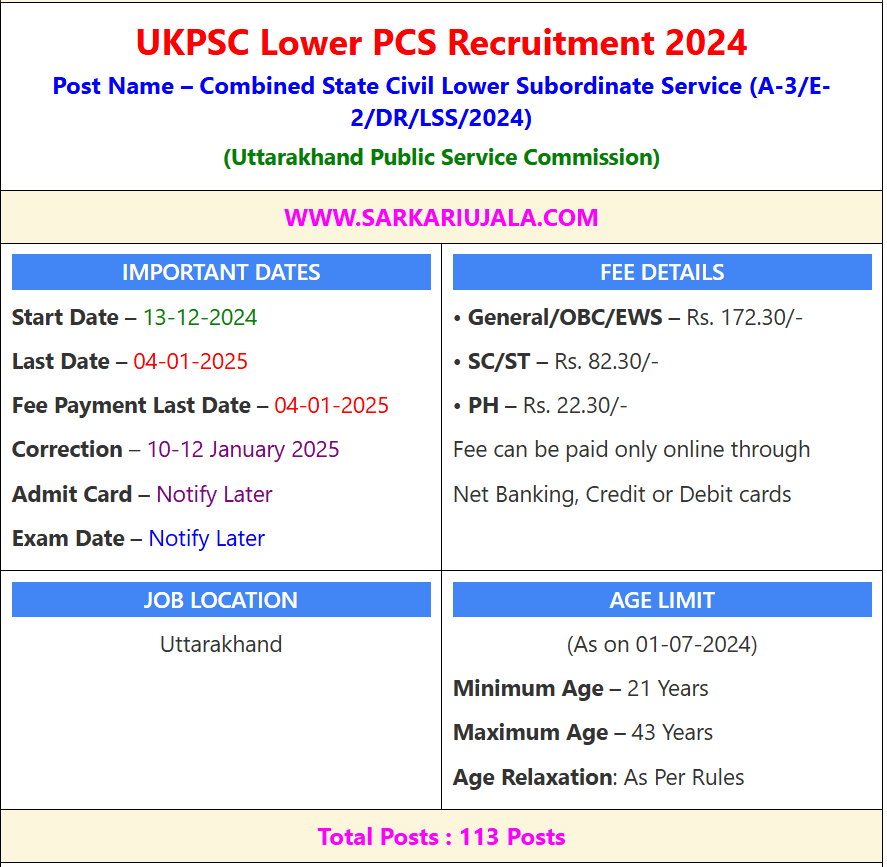 UKPSC Lower PCS Recruitment 2024Post Name – Combined State Civil Lower Subordinate Service (A-3/E-2/DR/LSS/2024)(Uttarakhand Public Service Commission) | |||||