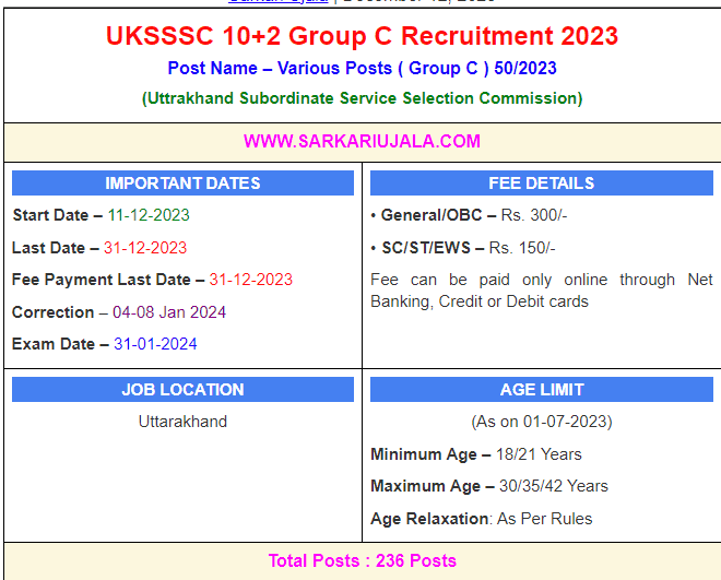 Post Description – UKSSSC Uttrakhand Subordinate Service Selection Commission is inviting online applications for Various Posts ( Group C ) for 236 posts. Interested people meet all the eligibility criteria, apply online Details Of Recruitment Of UKSSSC 10+2 Group C Online Form 2023Posts Name – Various Posts ( Group C ) Number Of Posts – 236 Posts Category Wise Posts – Transport Constable- 118 Posts Excise Constable- 100 Posts Deputy Excise Inspector- 14 Posts Hostel Manager Grade III- 02 Posts House Keeper (Female)- 02 Posts Pay Scale – As Per Rules Education Qualification – 10+2 Passed From Any Recognized Board in India. How to Apply Online UKSSSC 10+2 Group C Online Form 2023 – Candidates can apply through link provided below or they can also apply through official site of the Uttarakhand Public Service Commission before 31/December/2023. Required Documents For Online Application – Educational Mark sheet And Certificates Aadhar Card / Pan Card Passport Size Photo Signature Selection Mode – Written Exam PET/PST Merit List | |||||