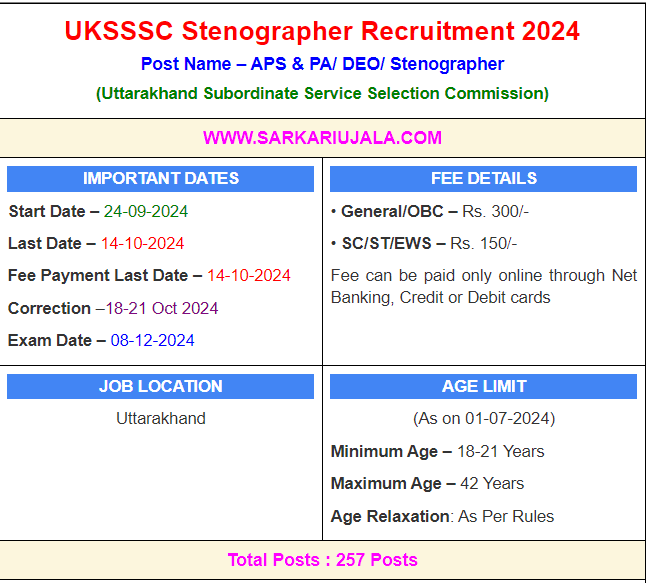 Post Description – UKSSSC Uttrakhand Subordinate Service Selection Commission is inviting online applications for APS & PA/ DEO/ Stenographer for 257 posts. Interested people meet all the eligibility criteria, apply online Details Of Recruitment Of UKSSSC Assistant Teacher Group C Online Form 2024Posts Name– APS & PA/ DEO/ Stenographer Number Of Posts – 257 Posts Pay Scale – As Per Rules Education Qualification – Additional Private Secretary (APS)- Graduate Degree And Stenography 80 WPM And Typing On Computer 4000 Key Impression In Hindi/English. PA/DEO/Steno- 10+2 Passed And Stenography 80 WPM And Typing On Computer 4000 Key Impression In Hindi/English. How to Apply Online UKSSSC Assistant Teacher Online Form 2024 – Candidates can apply through link provided below or they can also apply through official site of the Uttarakhand Public Service Commission before 14/October/2024. Required Documents For Online Application – Educational Mark sheet And Certificates Aadhar Card / Pan Card Passport Size Photo Signature Selection Mode – Written Exam Skill test Merit List | |||||