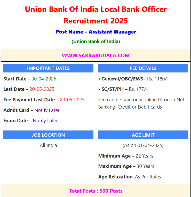 Post Description – Union Bank Of India is inviting online applications for Assistant Manager for 500 posts. Interested people meet all the eligibility criteria, apply online Details Of Recruitment Of Union Bank Assistant Manager Online Form 2025Posts Name – Assistant Manager Number Of Posts – 500 Posts State Wise Posts – Assistant Manager (Credit) – 250 Posts Assistant Manager (IT) – 250 Posts Pay Scale – As Per Rules Education Qualification – Assistant Manager (Credit) – Graduate Degree And CA/CMA/CS OR MBA/PGDM with 60 % Marks Assistant Manager (IT) – B.E/ B.Tech/ MCA/ M,Sc/ M.Tech in Related Field And 1 Year Post Qualification Experience. How to Apply Online Union Bank Assistant Manager Online Form 2025 – Candidates can apply through link provided below or they can also apply through official site of the Union Bank Of India before 20 May 2025. Required Documents For Online Application – Educational Mark sheet And Certificates Aadhar Card / Pan Card Passport Size Photo Signature Selection Mode – CBT Exam Group Discussion Interview Merit List
