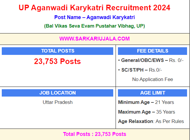 UP Aganwadi Karykatri Recruitment 2024Post Name – Aganwadi Karykatri(Bal Vikas Seva Evam Pustahar Vibhag, UP) | |||||