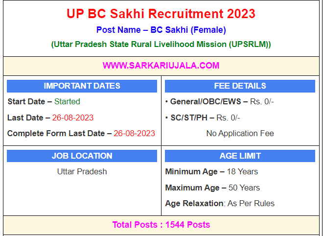 Post Description – Uttar Pradesh State Rural Livelihood Mission is inviting online applications for BC Sakhi for 1544 posts. Interested people meet all the eligibility criteria, apply online Details Of Recruitment Of UP BC Sakhi Online Form 2023Posts Name – BC Sakhi Number Of Posts – 1544 Posts Pay Scale – Rs. 4000/- Per Month Education Qualification – 10th Passed From A Recognized Board. How to Apply Online UP BC Sakhi Online Form 2023 – Candidates can apply through link provided below or they can also apply through official site of the Uttar Pradesh State Rural Livelihood Mission before 26/August/2023. Required Documents For Online Application – 10th Mark sheet And Certificates Aadhar Card / Pan Card Passport Size Photo Signature Selection Mode – DV Test Final Merit List